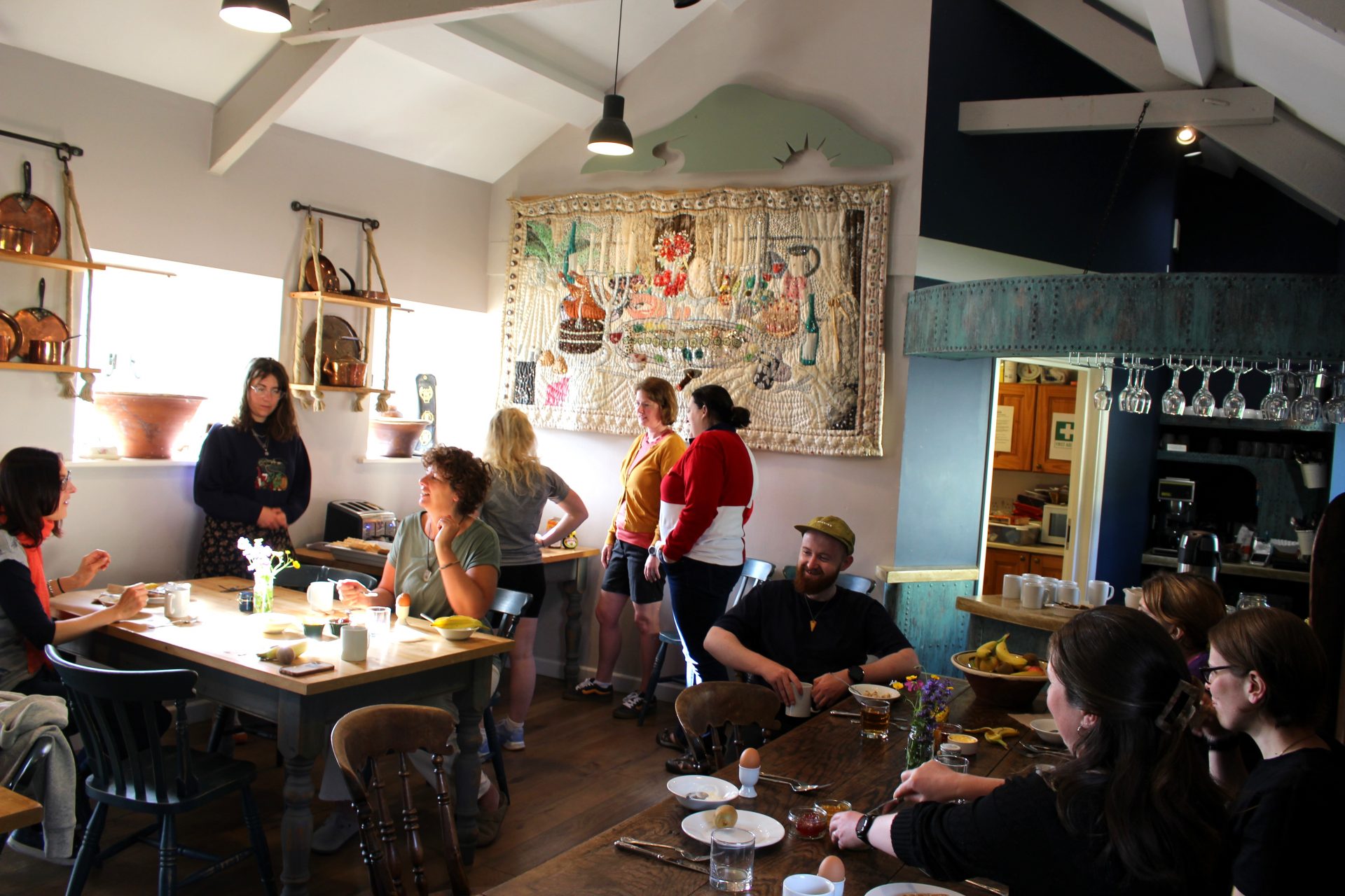 People staying overnight at Treberfedd walk across the courtyard to be welcomed with fresh coffee and breakfast. One day events are brought together with homemade cakes and freshly prepared lunches, such as hot dishes and fresh salads in summer. When available we use veg from local organic Blaencamel farm alongside from the organic farm at Treberfedd: beef, lamb, pork sausages, eggs and apples (for puddings!) supplied by me, the farmer. For al fresco dining in summer we use the large clay pizza oven to provide Treberfedd wood fired pizza parties.